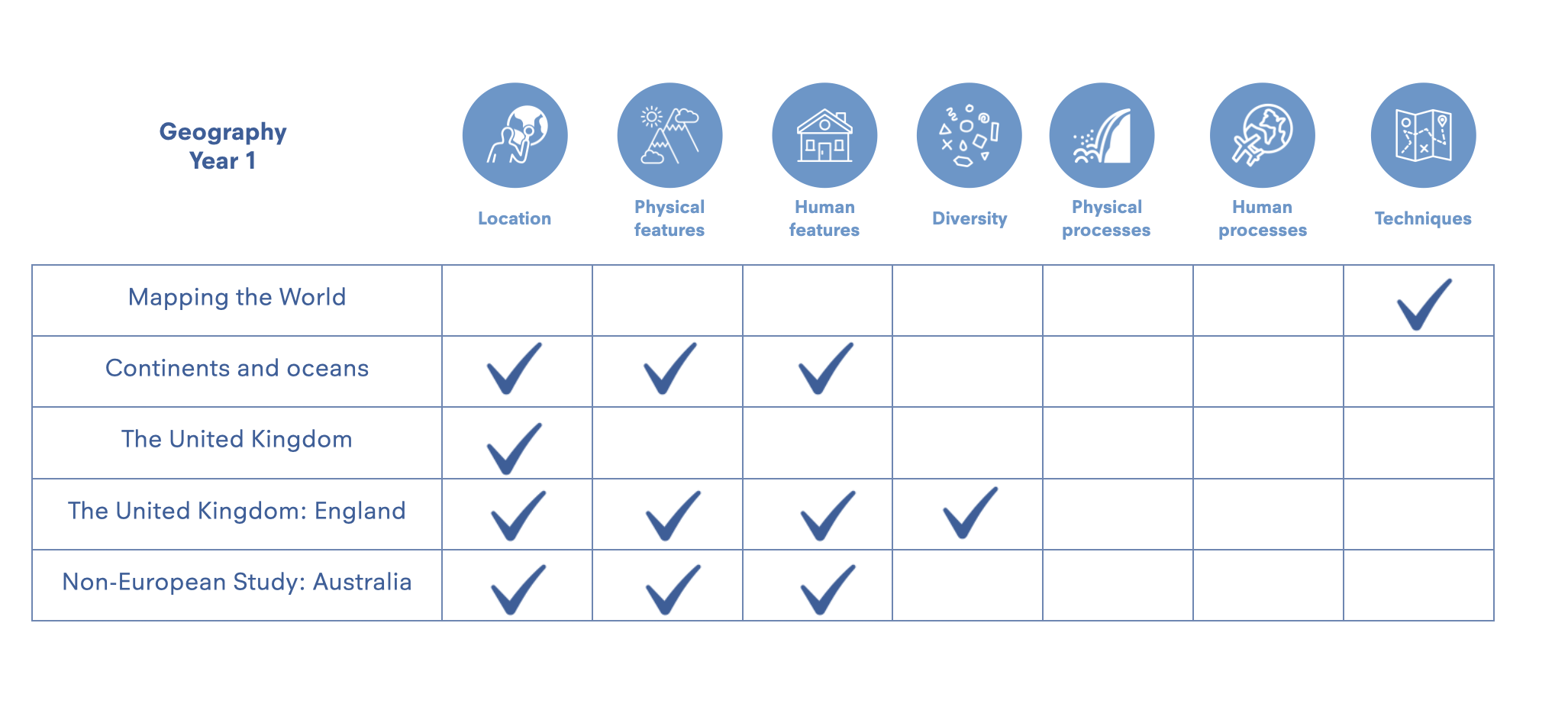 Knowledge Categories, as used in our Curriculum Companions, form the basis of a subject's schema, against which topics can be mapped. Here is an example of a geography schema with topics mapped against it: